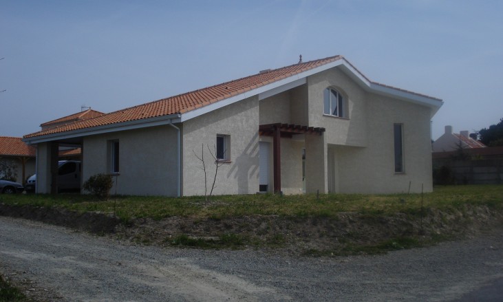 La forme de sa couverture tuile lui donne son caractère et son aspect original. La façade est agrémentée d’un auvent pergola bois en guise de rupture avec la maçonnerie et les ouvertures trouvent leur forme en accord avec les décrochés. La finition est en enduit traditionnel.